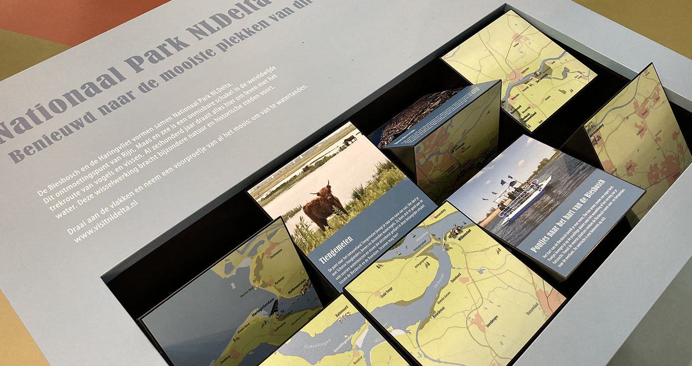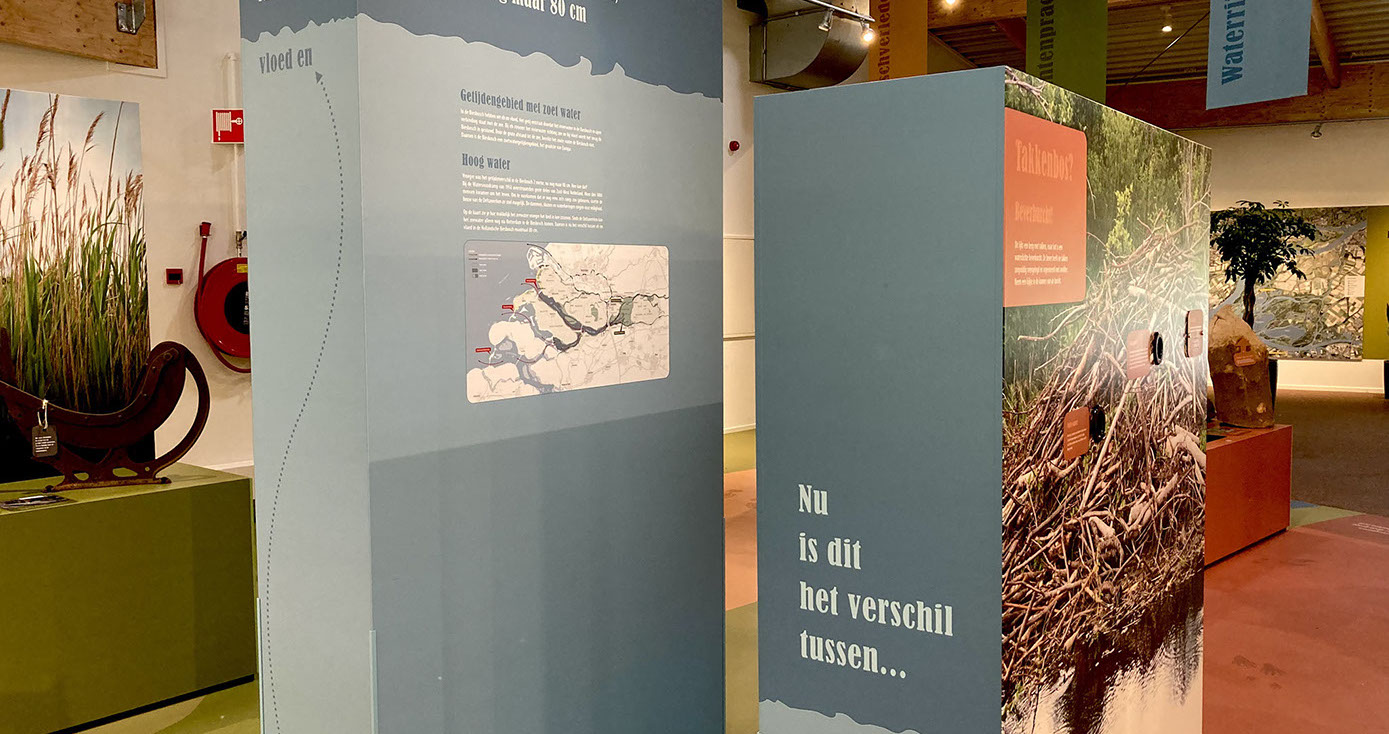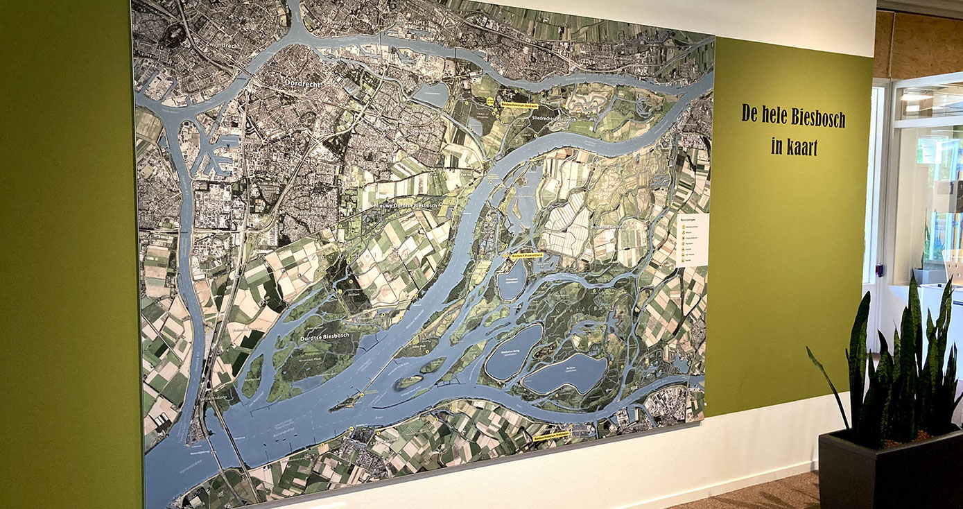 IN HET MUSEUM Het Biesboschcentrum Dordrecht is geheel vernieuwd het afgelopen jaar. BuroGlaap heeft hiervoor diverse kaarten ontworpen, waaronder een unieke bewerking op de Elisabetsvloed (1421). Hieronder een impressie.