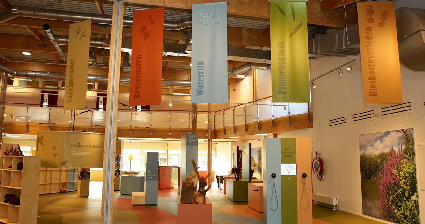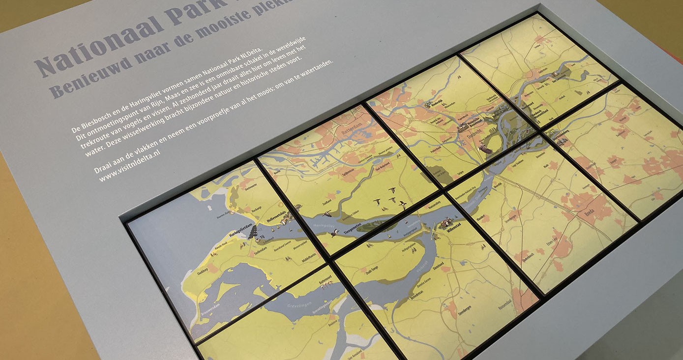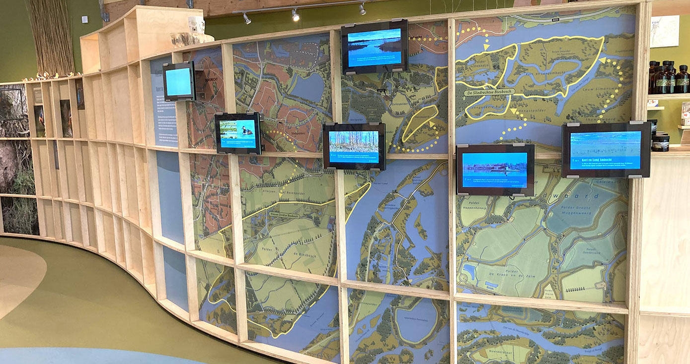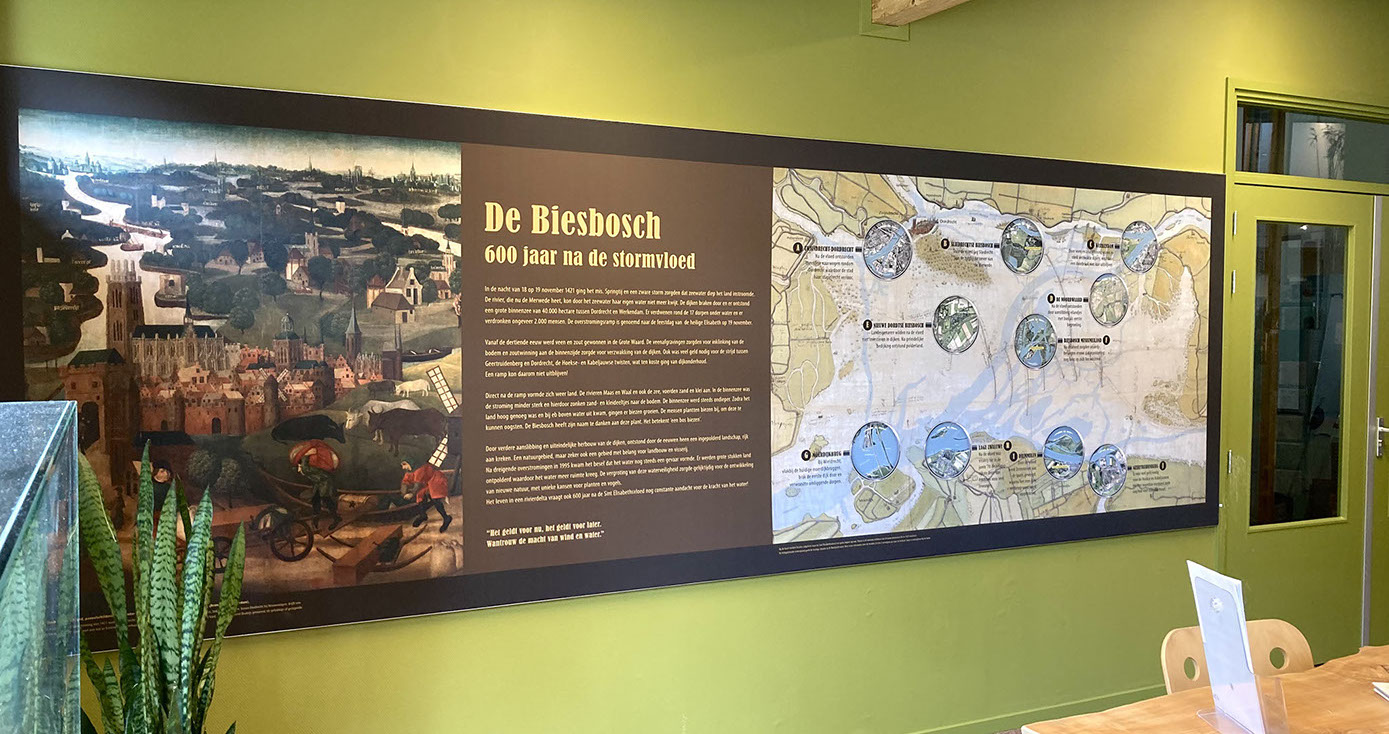 IN HET MUSEUM Het Biesboschcentrum Dordrecht is geheel vernieuwd het afgelopen jaar. BuroGlaap heeft hiervoor diverse kaarten ontworpen, waaronder een unieke bewerking op de Elisabetsvloed (1421). Hieronder een impressie.