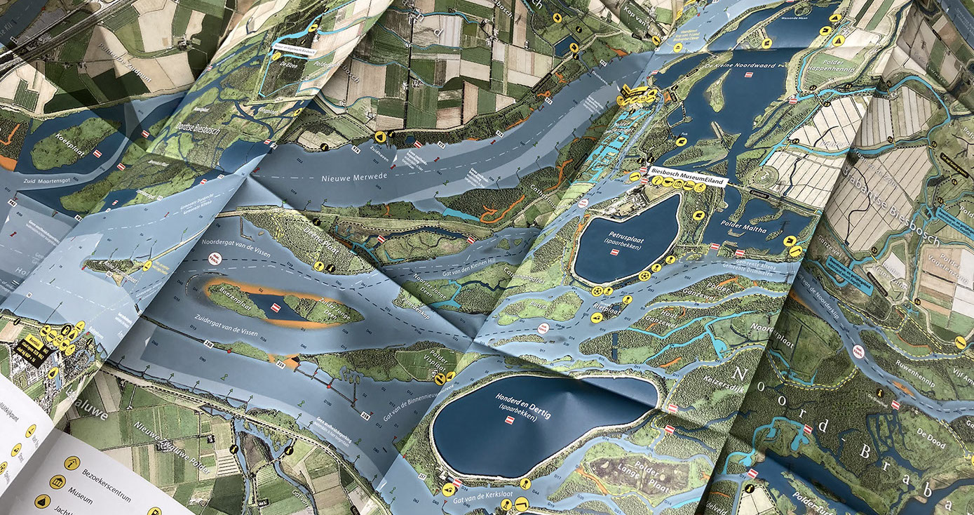 OP HET WATER Nieuwe Recreatie- vaarkaart de Biesbosch. Deze bijzondere vaarkaart is mede mogelijk gemaakt door Nationaal Park De Biesbosch in samenwerking met diverse partijen. Als uitgangspunt heeft BuroGlaap een satellietbeeld genomen.